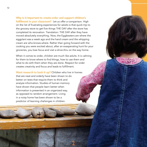 Why is it important to create order and support children%u2019s fulfillment in your classroom? Let us offer a comparison. High on the list of frustrating experiences for adults is that quick trip to the grocery store to get five things THE DAY after the store has completed its renovation. Translation: THE DAY after they have moved absolutely everything. Now, the Eggbeaters are where the eggplant was a week ago and the hand cream and the whipping cream are who-knows-where. Rather than going forward with the cooking you were excited about, after an exasperating hunt for your groceries, you lose focus and visit a drive-thru on the way home.When it comes to order, children are much like adults. It is calming for them to know where to find things, how to use them and what to do with them when they are done. Respect for order creates creativity and focus and leads to fulfillment.Want research to back it up?Children who live in homes that are neat and orderly have been shown to do better on tests that require them to think and analyze information. Studies of human memory have shown that people learn better when information is presented in an organized way, as opposed to random arrangement. Living in a noisy home has been shown to be a predictor of learning challenges in children.IDEA212