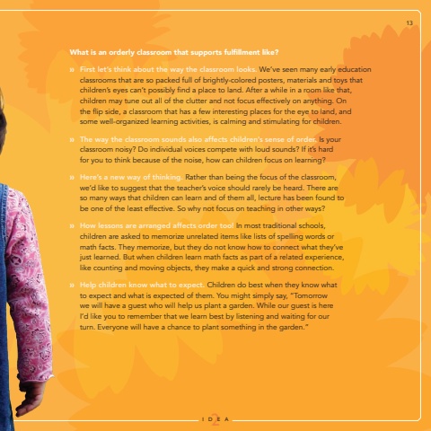 IDEA2What is an orderly classroom that supports fulfillment like?%u00bbFirst let%u2019s think about the way the classroom looks. We%u2019ve seen many early education classrooms that are so packed full of brightly-colored posters, materials and toys that children%u2019s eyes can%u2019t possibly find a place to land. After a while in a room like that, children may tune out all of the clutter and not focus effectively on anything. On the flip side, a classroom that has a few interesting places for the eye to land, and some well-organized learning activities, is calming and stimulating for children. %u00bbThe way the classroom sounds also affects children%u2019s sense of order. Is your classroom noisy? Do individual voices compete with loud sounds? If it%u2019s hard for you to think because of the noise, how can children focus on learning? %u00bbHere%u2019s a new way of thinking. Rather than being the focus of the classroom, we%u2019d like to suggest that the teacher%u2019s voice should rarely be heard. There are so many ways that children can learn and of them all, lecture has been found to be one of the least effective. So why not focus on teaching in other ways?%u00bbHow lessons are arranged affects order too! In most traditional schools, children are asked to memorize unrelated items like lists of spelling words or math facts. They memorize, but they do not know how to connect what they%u2019ve just learned. But when children learn math facts as part of a related experience, like counting and moving objects, they make a quick and strong connection.%u00bbHelp children know what to expect.Children do best when they know what to expect and what is expected of them. You might simply say, %u201cTomorrow we will have a guest who will help us plant a garden. While our guest is here I%u2019d like you to remember that we learn best by listening and waiting for our turn. Everyone will have a chance to plant something in the garden.%u201d13
