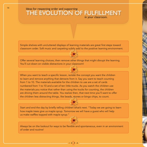 Simple shelves with uncluttered displays of learning materials are great first steps toward classroom order. Soft music and carpeting subtly add to the positive learning environment.Offer several learning choices; then remove other things that might disrupt the learning.You%u2019ll cut down on visible distractions in your classroom! When you want to teach a specific lesson, isolate the concept you want the children to learn and remove anything that detracts from it. Say you want to teach counting from 1 to 10. The materials available for the children to use are a set of cards numbered from 1 to 10 and a set of ten little trucks. As you watch the children use the materials you notice that rather than using the trucks for counting, the children are driving them around the table. You realize then, that next time you%u2019ll want to offer the children less distracting things, like beads, stones or bingo chips, to count.Start and end the day by briefly telling children what%u2019s next. %u201cToday we are going to learnhow maple trees give us maple syrup. Tomorrow we will have a guest who will helpus make waffles topped with maple syrup.%u201dAlways be on the lookout for ways to be flexible and spontaneous, even in an environment of order and routine!THE EVOLUTION OF FULFILLMENT Ideas for respecting order and supporting in your classroom.IDEA214