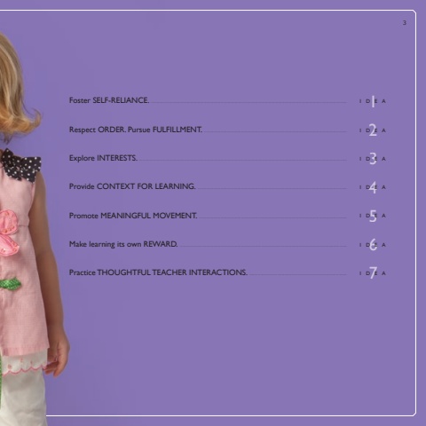 IDEA3IDEA2IDEA1IDEA3IDEA4IDEA5IDEA6IDEA7Foster SELF-RELIANCE. Respect ORDER. Pursue FULFILLMENT. .......................................................................................................................Explore INTERESTS. .............................................................................................................................................................................Provide CONTEXT FOR LEARNING. ............................................................................................................................Promote MEANINGFUL MOVEMENT. Make learning its own REWARD. Practice THOUGHTFUL TEACHER INTERACTIONS. .................................................................................3
