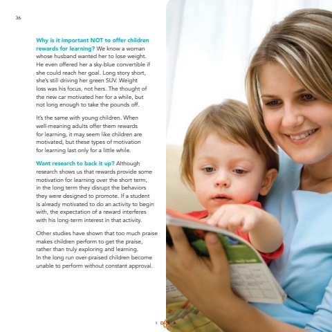Why is it important NOT to offer children rewards for learning? We know a woman whose husband wanted her to lose weight. He even offered her a sky-blue convertible if she could reach her goal. Long story short, she%u2019s still driving her green SUV. Weight loss was his focus, not hers. The thought of the new car motivated her for a while, but not long enough to take the pounds off.It%u2019s the same with young children. When well-meaning adults offer them rewards for learning, it may seem like children are motivated, but these types of motivation for learning last only for a little while.Want research to back it up? Although research shows us that rewards provide some motivation for learning over the short term, in the long term they disrupt the behaviors they were designed to promote. If a student is already motivated to do an activity to begin with, the expectation of a reward interferes with his long-term interest in that activity. Other studies have shown that too much praise makes children perform to get the praise, rather than truly exploring and learning. In the long run over-praised children become unable to perform without constant approval.IDEA636