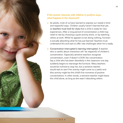 IDEA7If the teacher interacts with children in positive ways, what happens in the classroom?%u00bbAs adults, most of us have learned to express our needs in kind and respectful ways. Children usually haven%u2019t learned that yet, so teachers must look for clues that a child is ready for new experiences. After a long period of concentration a child may need to rest by choosing a quiet activity alone, or by watching others at work. While he appears to be doing nothing, his brain is actually absorbing what he has just learned. Teachers must understand this and wait to offer new challenges when he is ready.%u00bbConcentration interrupted is learning interrupted. A teacher who is careful about interaction will be respectful of children%u2019s concentration. Especially sensitive teachers recognize concentration, even if doesn%u2019t LOOK like concentration. Say a child who has been disorderly in the classroom one day suddenly begins to rearrange the furniture. Many teachers would be inclined to stop her, but a sensitive teacher would wait to see if her activity might come to a useful end (this activity might be the child%u2019s first moments of positive concentration). In other words, a sensitive teacher might leave this child alone, as long as she wasn%u2019t disturbing others.43
