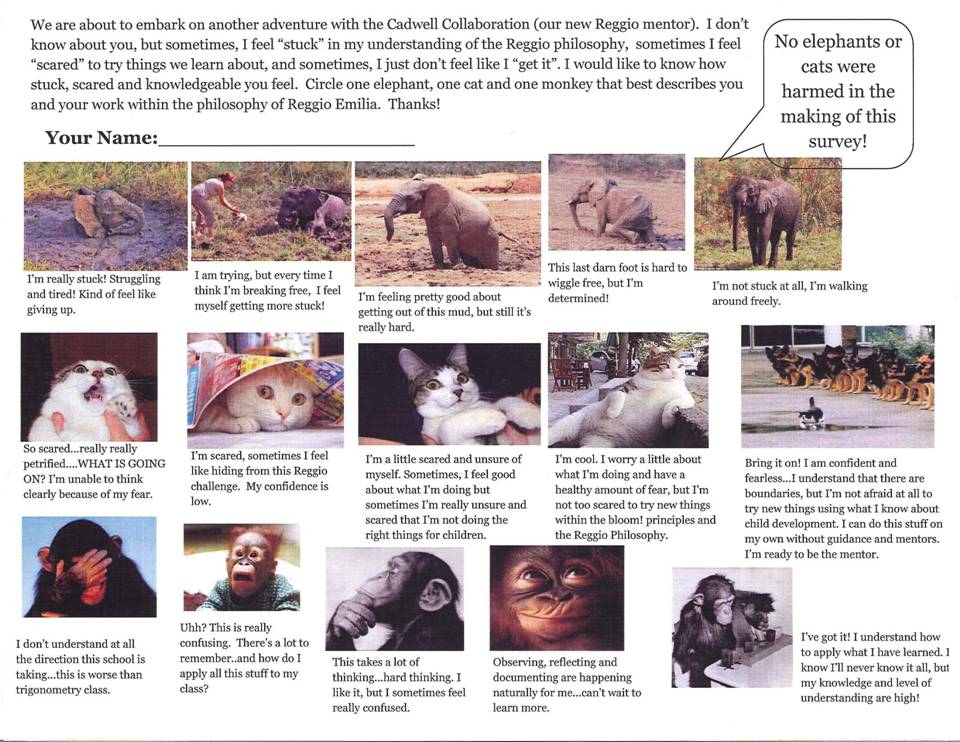 Here is a great idea from Sherry Hanchar, the executive director of Butler Early Education (BEE) in Butler Indiana. Take a look at this survey below to see how Sherry took a previously un-measurable thing (“How are you feeling about the changes we’re being asked to make?”) and came up with a way to measure progress.