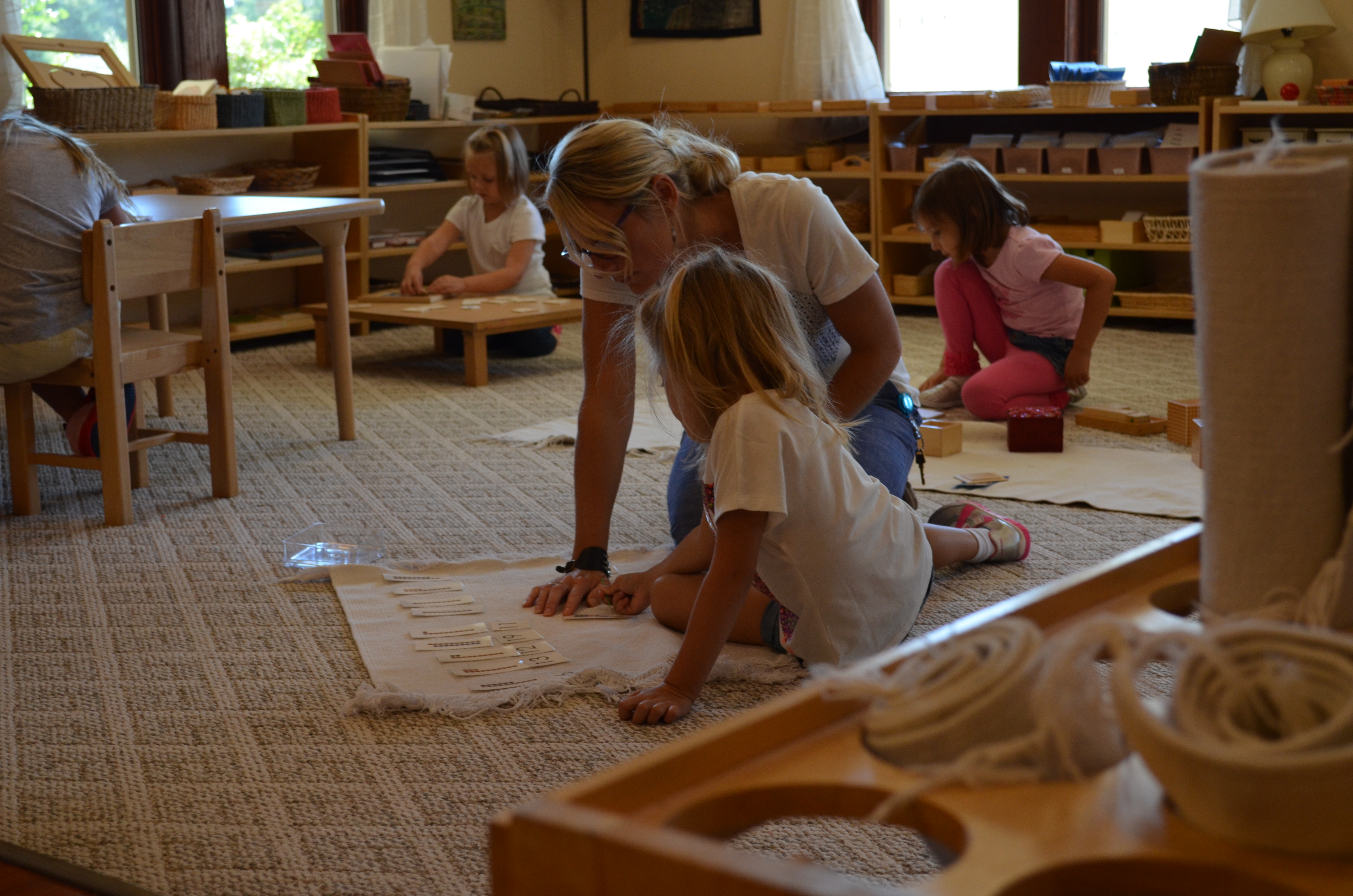 Three-year-olds at Oak Farm spend much of their day engaged in work, or lessons, of their own choice. They also care for their classroom’s pets and houseplants, and make sure that the area is clean for the next day.